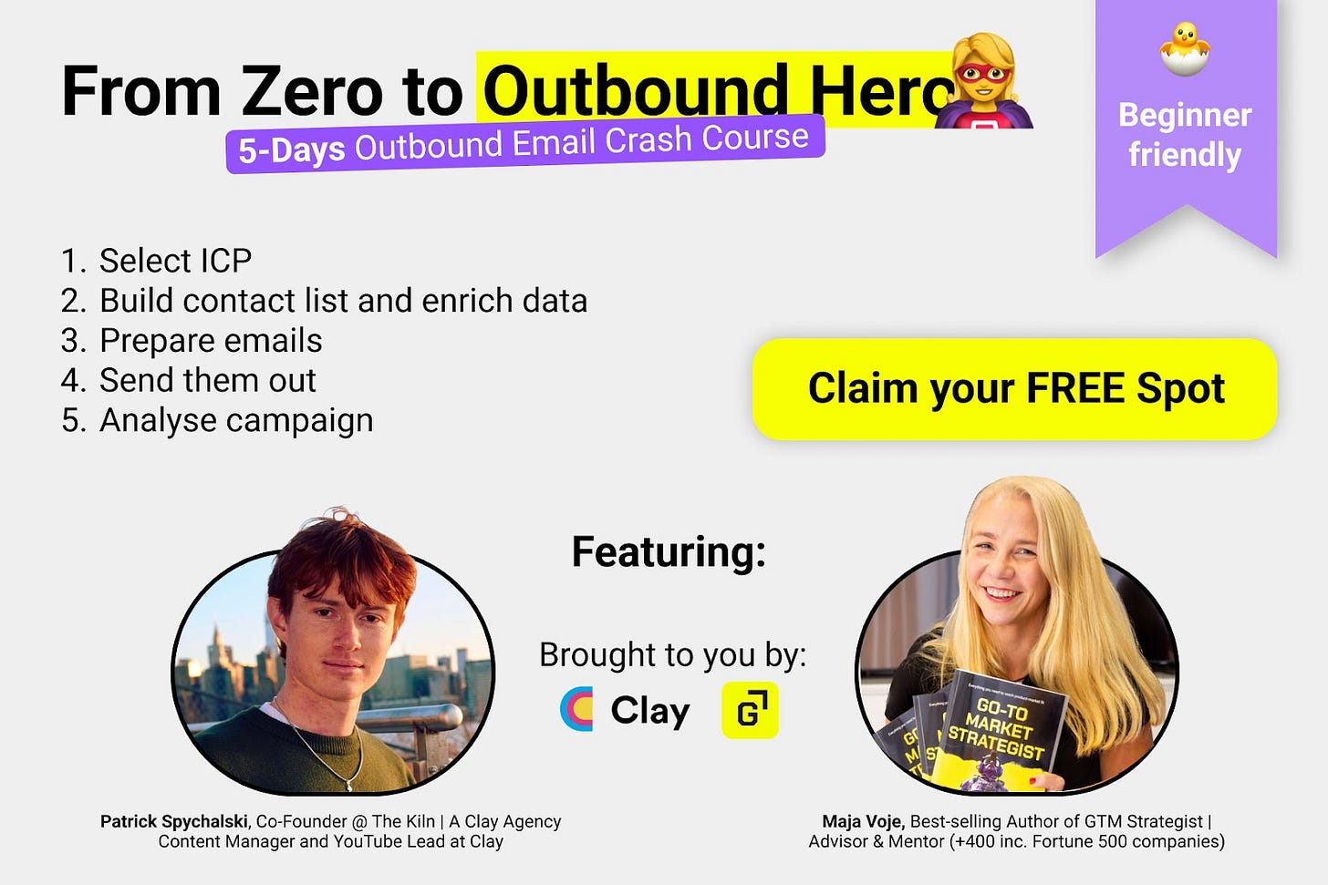 Patrick Spychalski, Content manager at Clay, and I aim to launch a free email outbound course. It will take you from 0 to outbound hero in merely a week 🎓 !