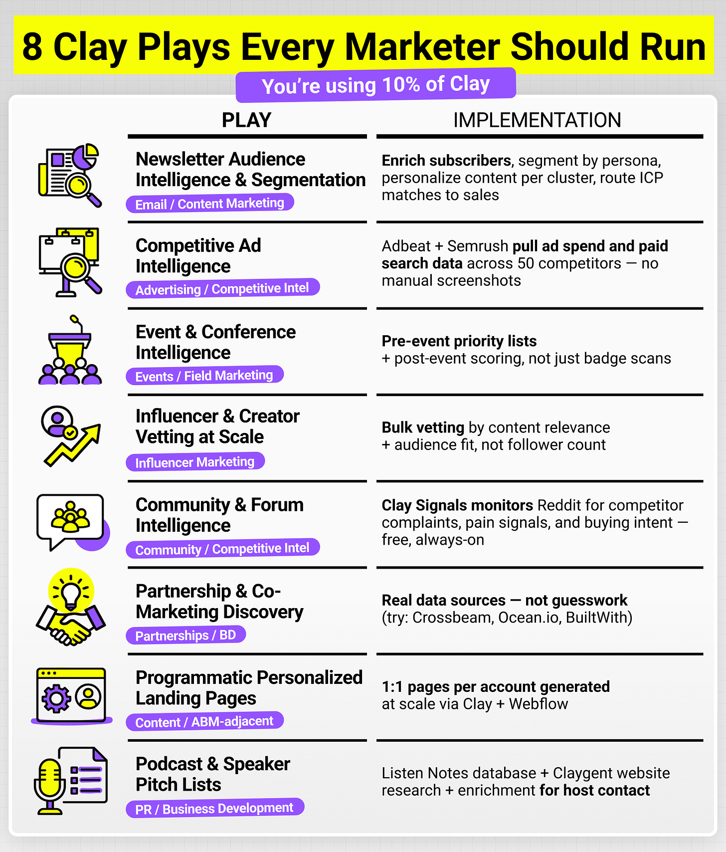 People don’t like it when I say that marketers should move into the role of business developers, sharing tools with RevOps, but that is exactly how we enable marketers to squeeze more out of the activities they are already putting so much time, money, and effort into. By working hand in hand with Marketing leaders in my clients’ orgs and running 50+ Clay tables for them, I put together a starter pack of 8 plays that show you how to use Clay across your entire marketing stack.