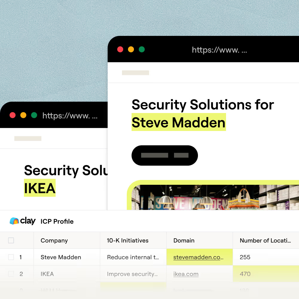 The play: Start with your target account list in Clay. Enrich with company data and use Claygent to research each account’s likely business challenge (from job postings, recent news, public strategy signals). Then generate page copy per account — headline, value proposition, case study match, and CTA — all tailored to that account’s situation.