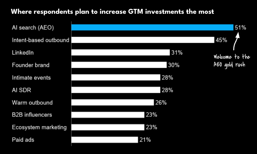 So it’s no surprise that 51% of GTM practitioners said they plan to increase their investment in AI discovery and Answer Engine Optimization (AEO) in 2026 (source) — the top channel bet by a wide margin.
