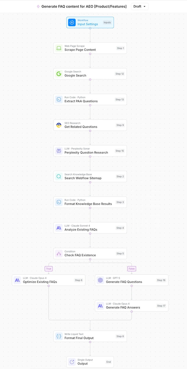 His team built an AI workflow in AirOps that used Perplexity to deep-research Google’s “People Also Ask” results, Reddit threads, and niche forums to surface the exact questions buyers were actually asking. From there, the workflow identified gaps in existing FAQ content, generated high-intent Q&A pairs, wrote on-brand answers, and auto-structured everything into clean schema markup.
