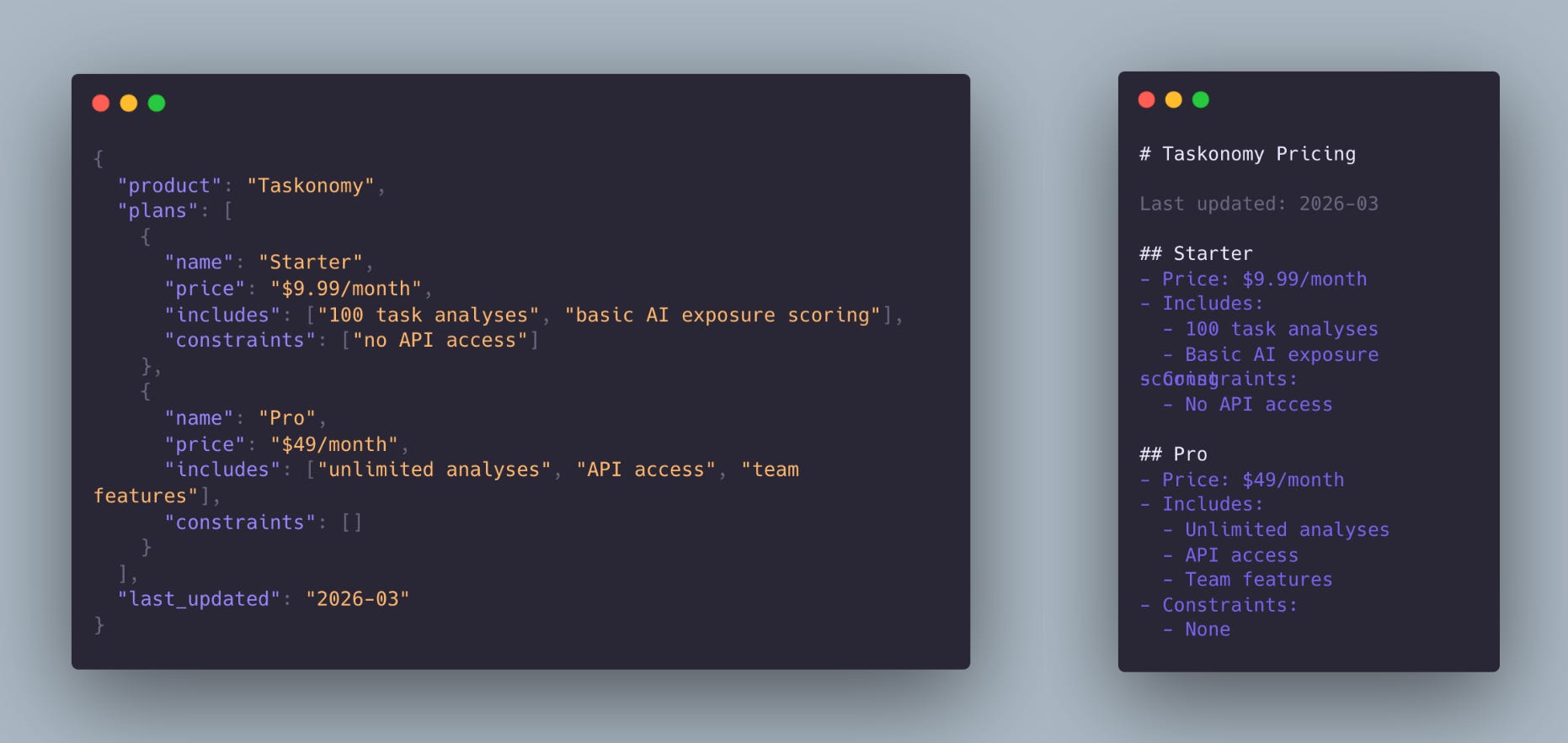 For example, in addition to a typical pricing page written for humans, expose a machine-readable version alongside it: a /pricing.json or /pricing.md that an agent can reliably parse.