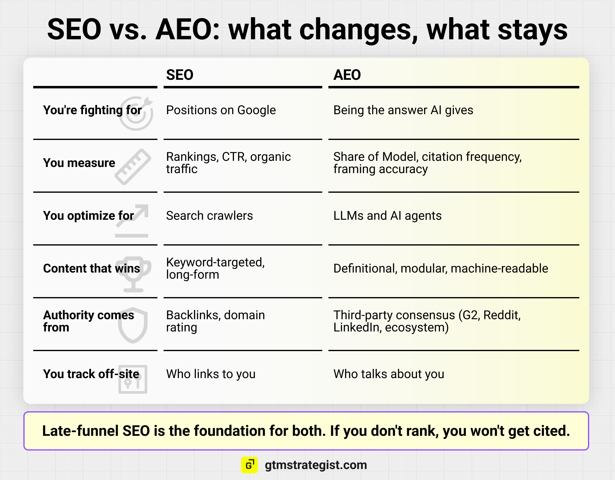 It’s not “new SEO.” AEO extends SEO — it doesn’t replace it. Late-funnel SEO is the foundation. If you don’t rank for “[your category] for [use case],” you probably won’t show up in AI answers either. AI models pull from the same sources that rank in traditional search.