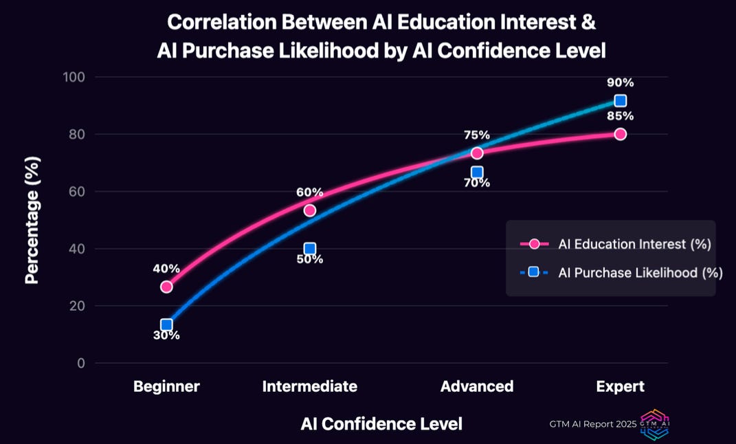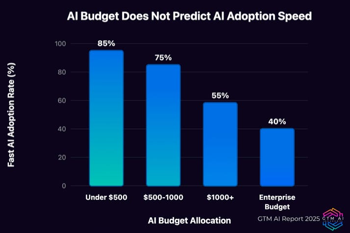 In the GTM AI 2025 Report this is beautifully highlighted on two charts. The first one illustrates that the budgets for AI are not the best predictor of successful AI adoption (these are monthly budgets per employee). The second one illustrates that our enthusiasm for learning AI and playing with its implementations is a much better predictor of adoption. I love that!