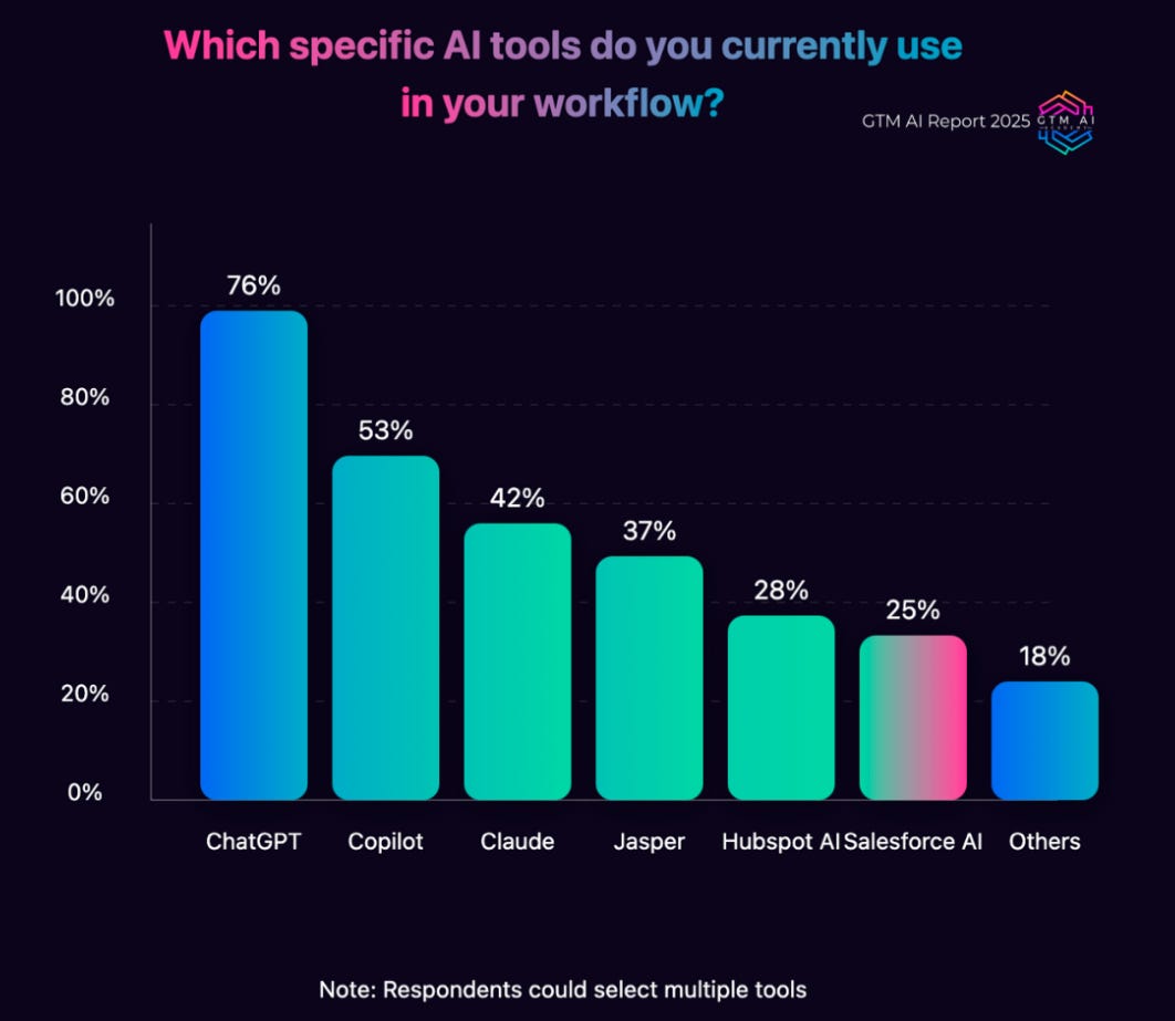 What was fascinating for me to see in this report is that no matter all the FOMO we get on social media, we are still early in the space if we have AI implementations that bring value. From the chart below, you see that the majority of GTM leaders use mainstream tools such as ChatGPT, Copilot, Claude, Jasper, etc.