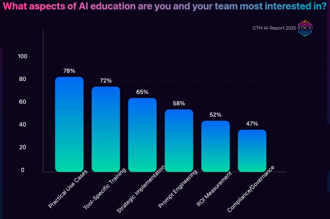 This week, I want to invite you on a journey of how early adopters of AI in GTM are pioneering the change. My colleague Jonathan Kvarfordt, revenue enablement expert and AI GTM Advisor, created a GTM AI 2025 Report. 276 AI GTM early adopters pitched in. Since we supported the survey, we have gotten an early preview of his work, and in this post, I’d like to share with you five things I found most interesting: