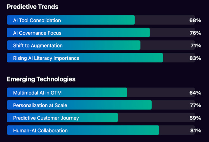 GTM AI 2025 Report highlighted the following predictive trends and emerging technologies. What I found most interesting are predictive customer journeys in which you anticipate your user's future needs (that is very cool) and Human-AI collaborations - which is not saying: “Bad AI, let me show you how this is being done” - but seriously creating synergies between AI’s and our superpowers.
