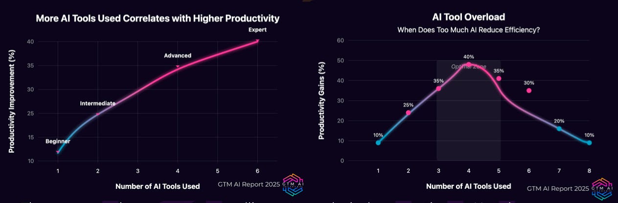Most proficient AI users in the report stated that they use 4-6 AI tools, but the overall data shows that productivity leaps dramatically up to 40% with 4 AI tools. Instead of constantly shopping for the latest and greatest AIs, we should squeeze the most added value out of our existing tools.