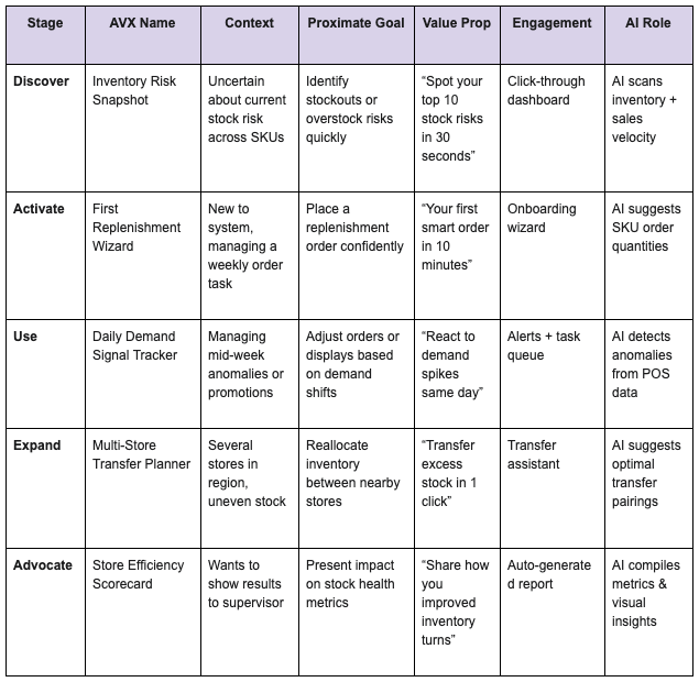 The unit of value in an AVX is intentionally small, clear, and specific to a target persona. It’s designed to be immediately useful, self-contained, and easily measurable — making it ideal for: