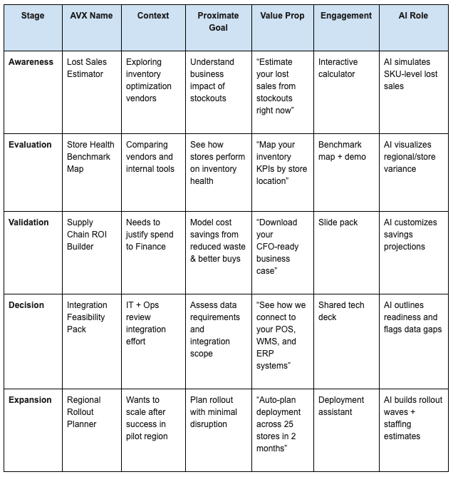 What It Means: Each AVX can be tailored to a specific GTM channel (e.g. email, live demo, outbound SDR).