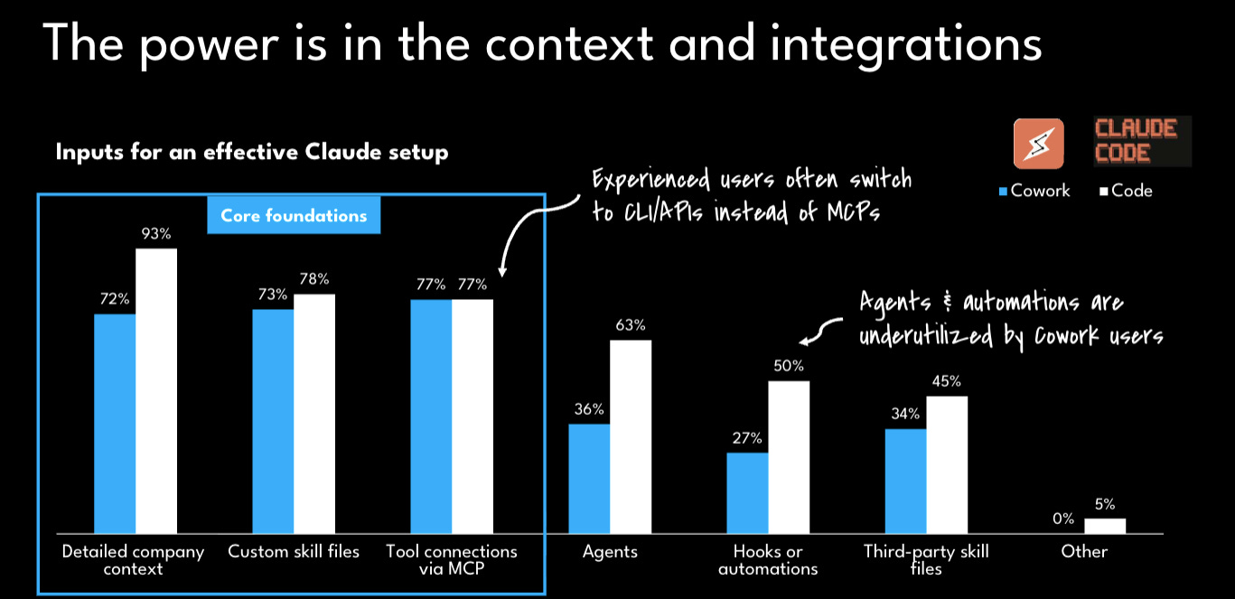 The core insight from the data: 93% of Claude Code users rely on detailed company context1 as a core foundation, vs. 72% of Cowork users. That gap tells you who is building a compounding system and who is running sophisticated tasks.