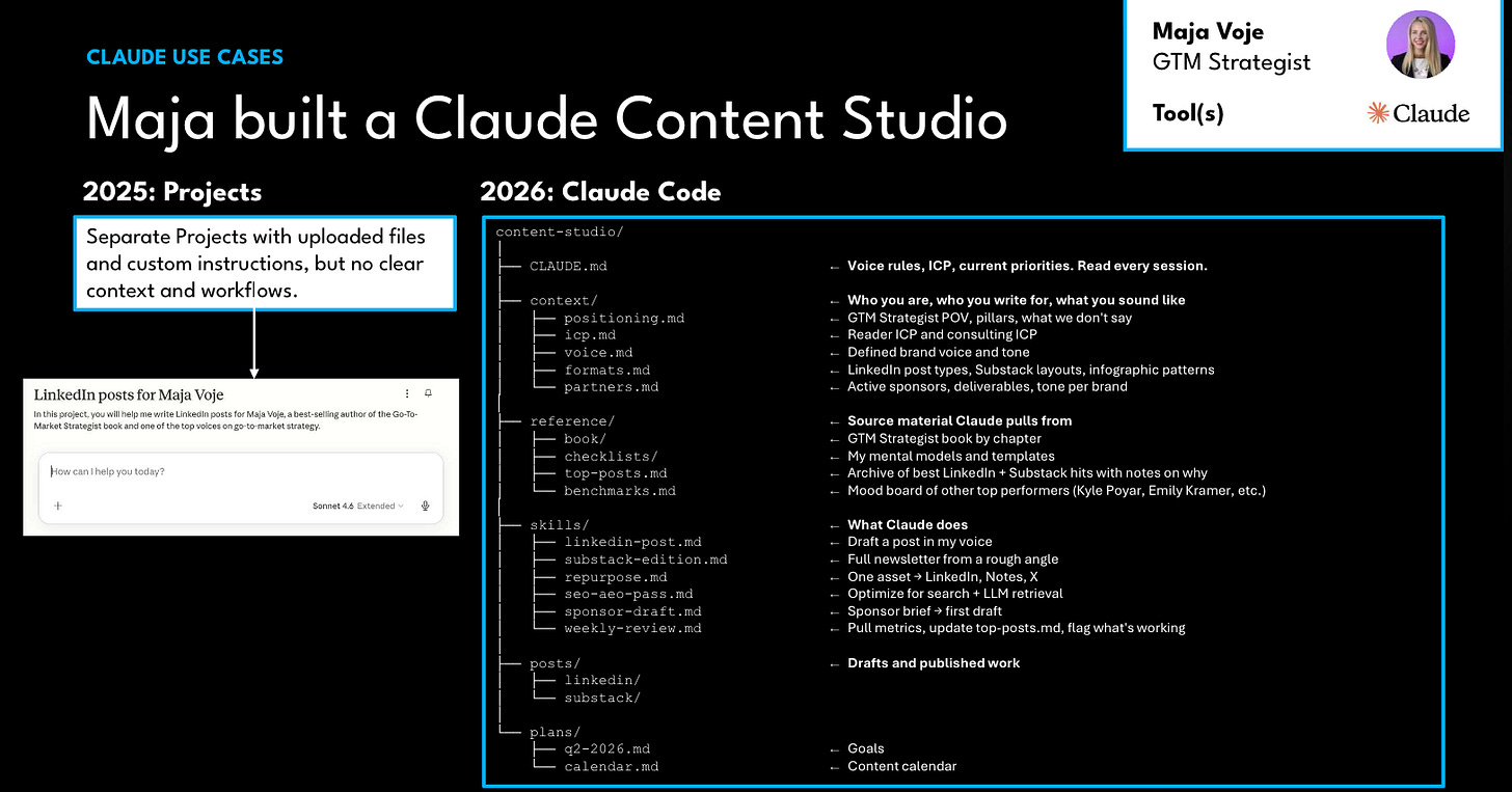The thing that separates content in Claude Code/Cowork from content in Claude Chat is context engineering. With Code or Cowork, you can encode your brand voice, your ICP, your top-performing posts, your sponsor briefs - and Claude pulls exactly what is relevant for the task at hand. The more you feed the system, the better the output gets.
