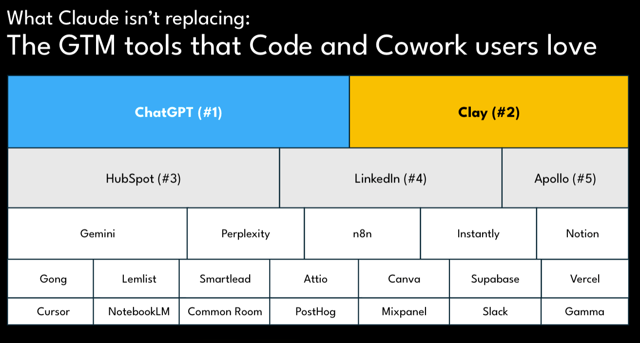 What makes this category different is the combination of tools. GTM engine builders are not using Claude in isolation. They are wiring it into a stack. The tools that Code and Cowork users love the most are ChatGPT (#1, mentioned by 26% of respondents), Clay (#2 at 21%), HubSpot (#3 at 19%), LinkedIn (#4), and Apollo (#5).