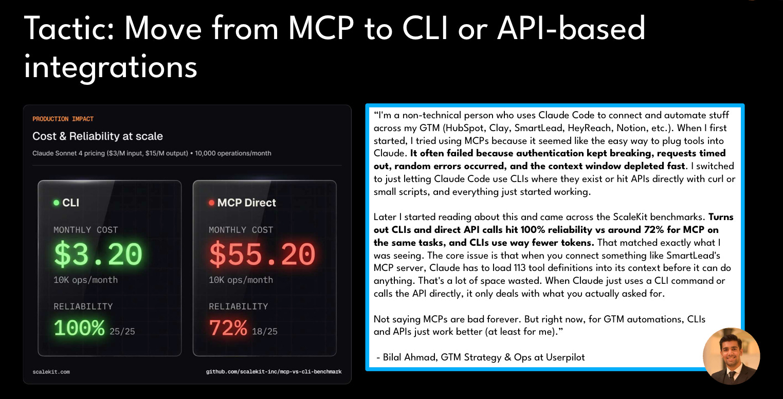 Move from MCP to CLI or direct API calls for reliability - ScaleKit benchmark data shows CLI hits 100% reliability vs around 72% for MCP, at a fraction of the token cost