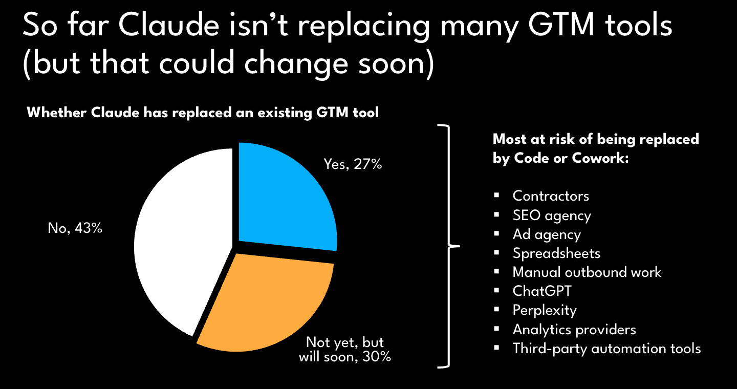 On the tool replacement side, only 27% have replaced an existing GTM tool so far, 30% say they will soon, and 43% say no. Most at risk are contractors, SEO agencies, ad agencies, spreadsheets, manual outbound work, ChatGPT, Perplexity, analytics providers, and third-party automation tools.