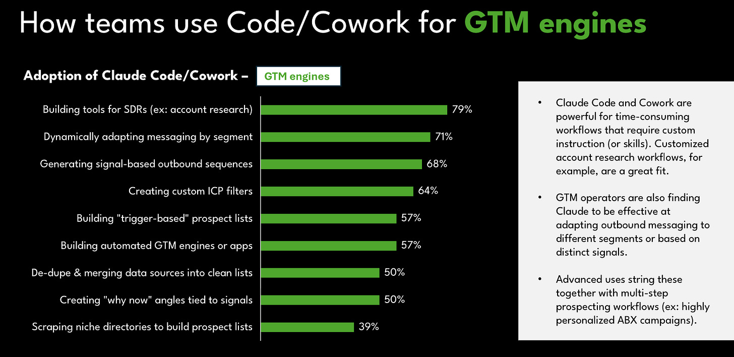 GTM engineers are wiring Claude Code into stacks and systems, not using it solo but in combination with other tools. Most common use cases so far: 79% are building SDR research tools and 71% adapting messaging dynamically by segment.