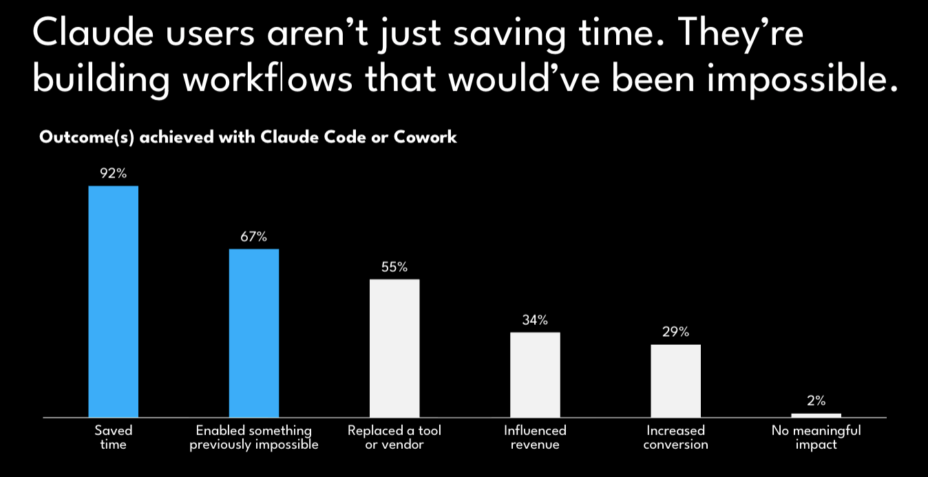 92% reported that Claude Code and Cowork help them “save time”, but more interestingly, 67% have reported building workflows that were previously impossible. But just 27% have replaced a GTM tool so far - the SaaS apocalypse crowd might be getting ahead of the data.