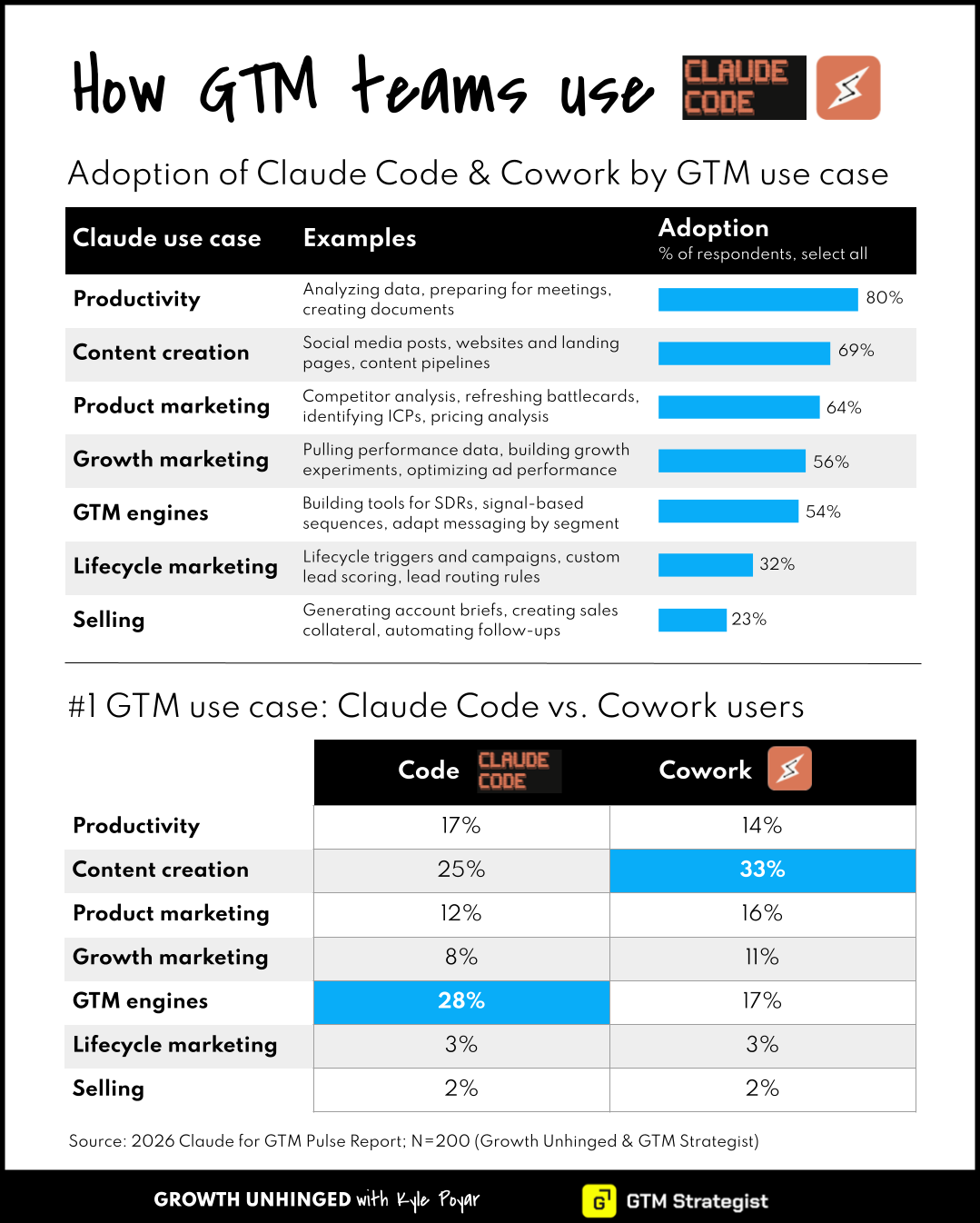Kyle Poyar (Growth Unhinged) and I surveyed 200 GTM AI operators and curated their best insights into the 2026 Claude for GTM Pulse Report, focusing on how they use Claude Cowork and Code, the value teams get from these tools, and their limitations.