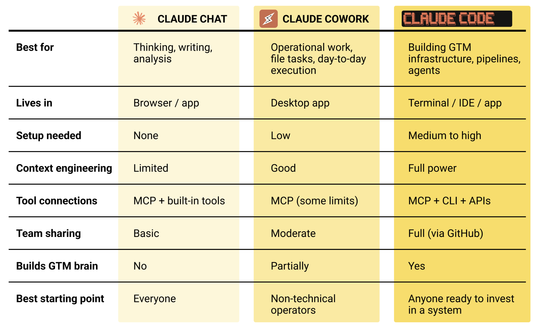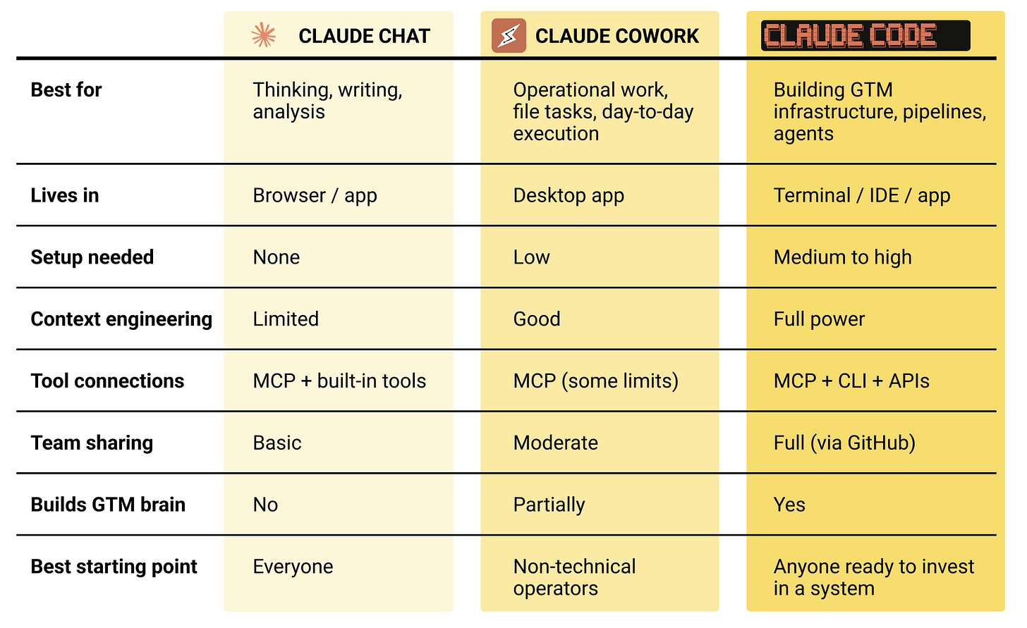 *"Builds GTM brain."* This is the marketing-overreach line. It's Voje's framing, which makes sense given her brand, but as a capability claim it's vacuous — a "GTM brain" isn't a product feature, it's a thing you build *using* the tools. Any of the three can contribute depending on what you're doing. Partially/No/Yes here is more about which surface Voje personally uses to build systems than anything intrinsic.