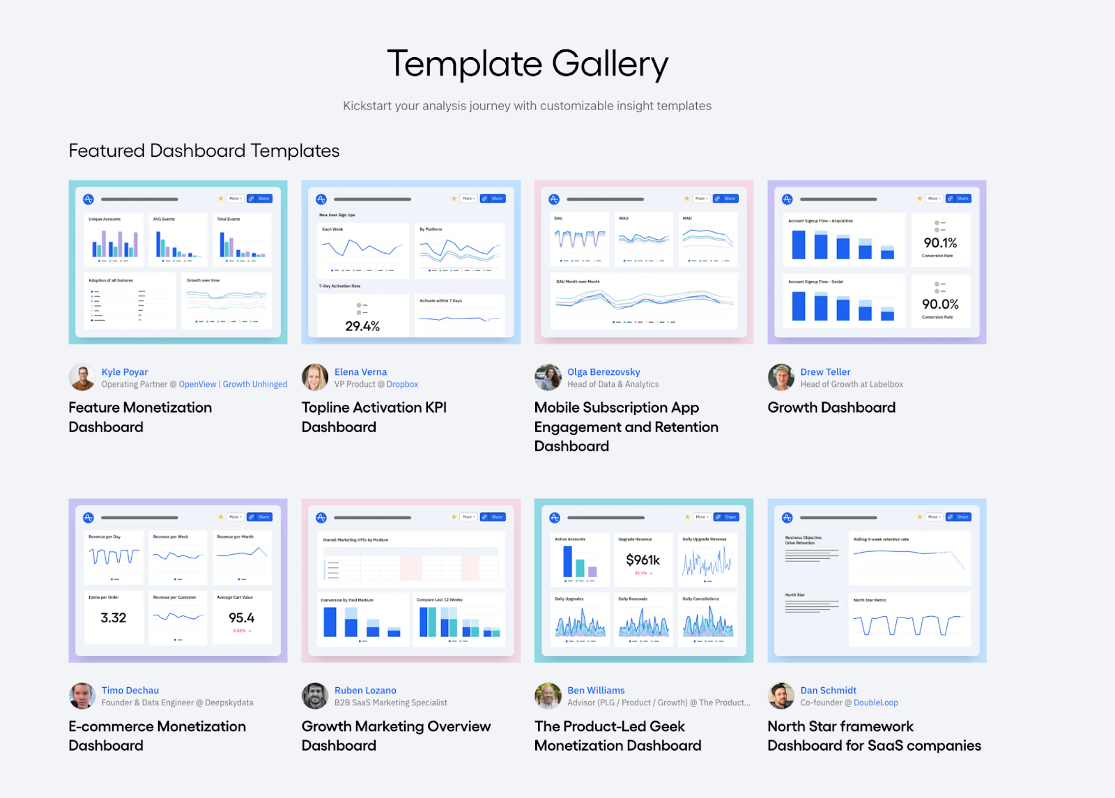 Beginner: If you don’t know which metrics to display on your dashboard, check out this beautiful moodboard for inspiration. Growth and product legends such as Elena Verna, Kyle Poyar, Ben Williams, Leah Tharin, and many other experts have pitched in with FREE templates for almost any tech product business model you can think of.