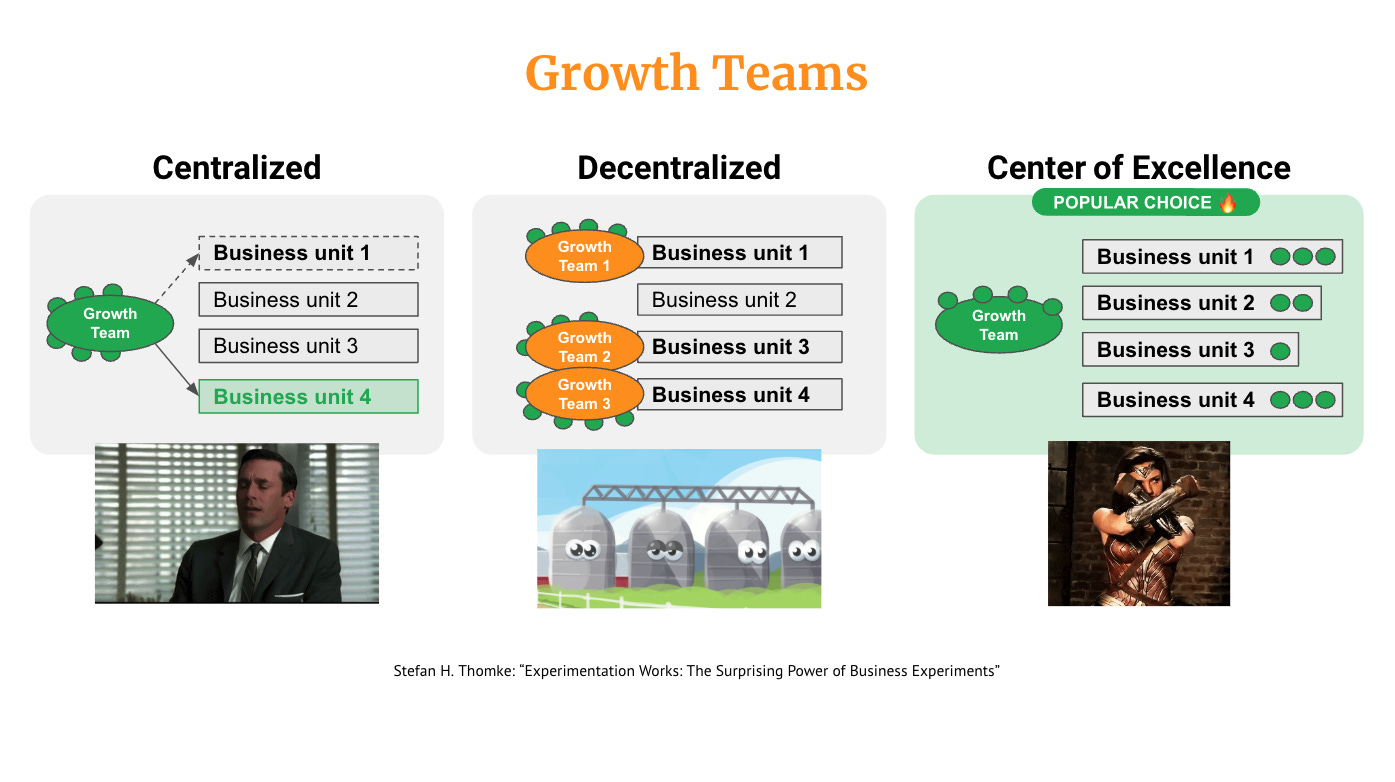 Center of Excellence aka “team of teams”: You have a growth team as a standalone department serving different business units and formulating growth teams within them.