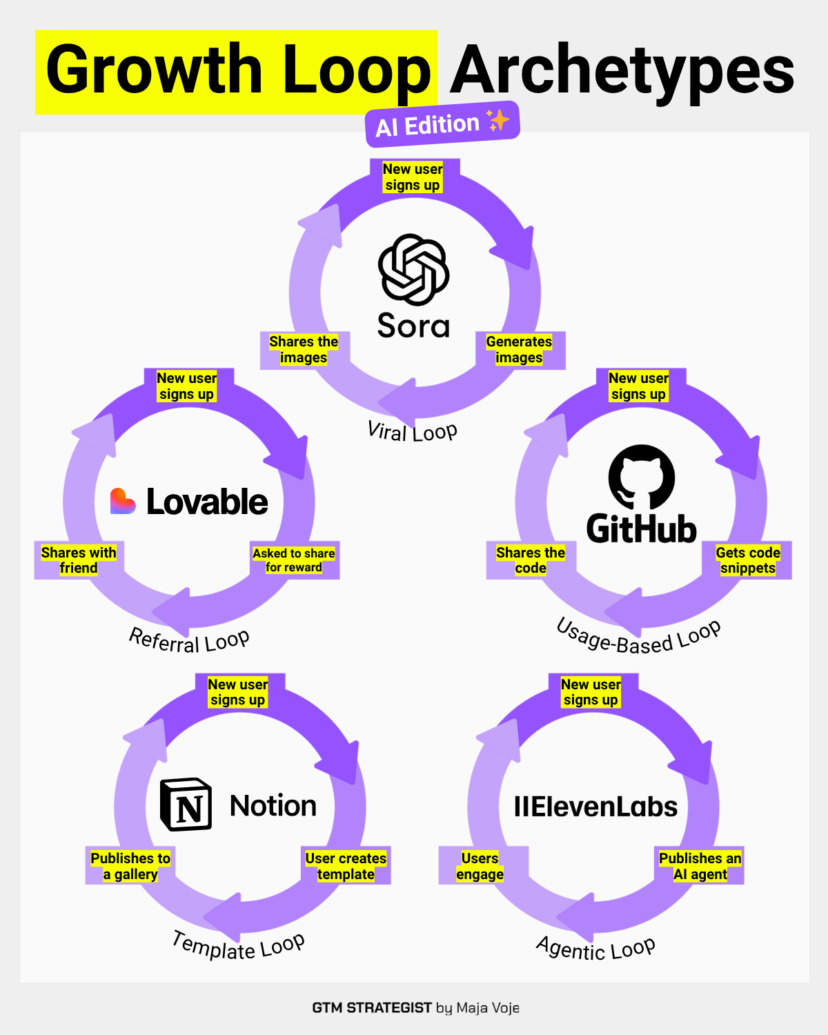 Whenever I start explaining growth loops to someone (keynotes, workshops, mentorship sessions, my book), this is the hero visual that really helps them “get it”. Below are the 5 core growth‐loop archetypes I detail in my GTM Strategist book. Each one shows how you can turn customer actions into self‐reinforcing acquisition channels: