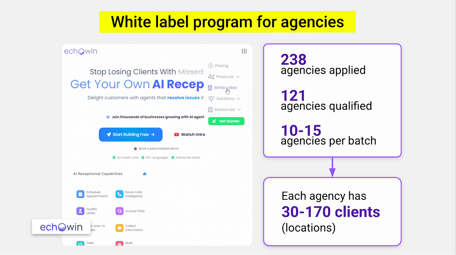Inspired by this beachhead strategy (target agencies for faster adoption), our client, echowin launched a white-label AI voice-building platform for agencies. Think about voice agents for a sec - AI receptionist, AI support agents … usually they are used by service businesses (car repair shops, restaurants, legal offices, energy companies, etc.).