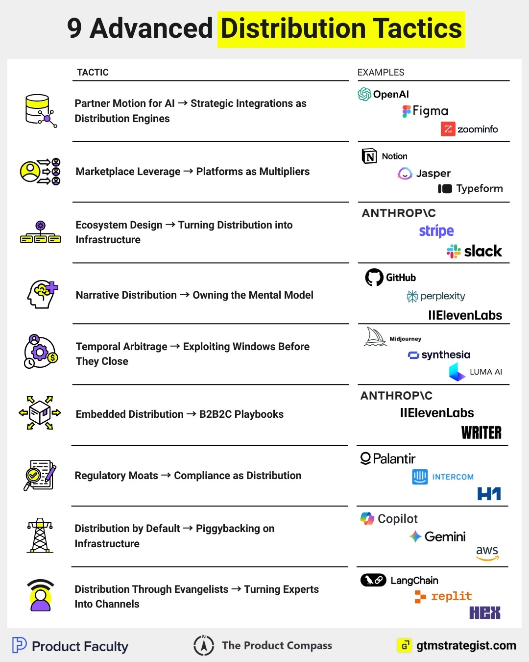 There is more to it. Miqdad Jaffer, Product Leader at OpenAI, introduced this wonderful model of 9 advanced distribution tactics that create massive leverage for AI products (he shared this in The Product Compass Substack - must read!).