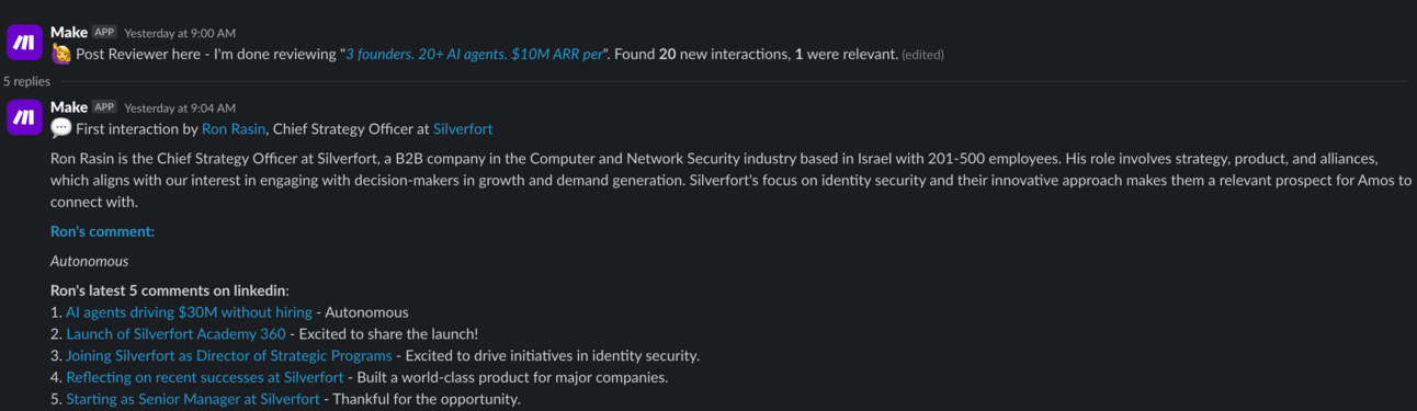 The Observer is my LinkedIn intelligence agent, designed to monitor engagement across my content and identify potential leads.