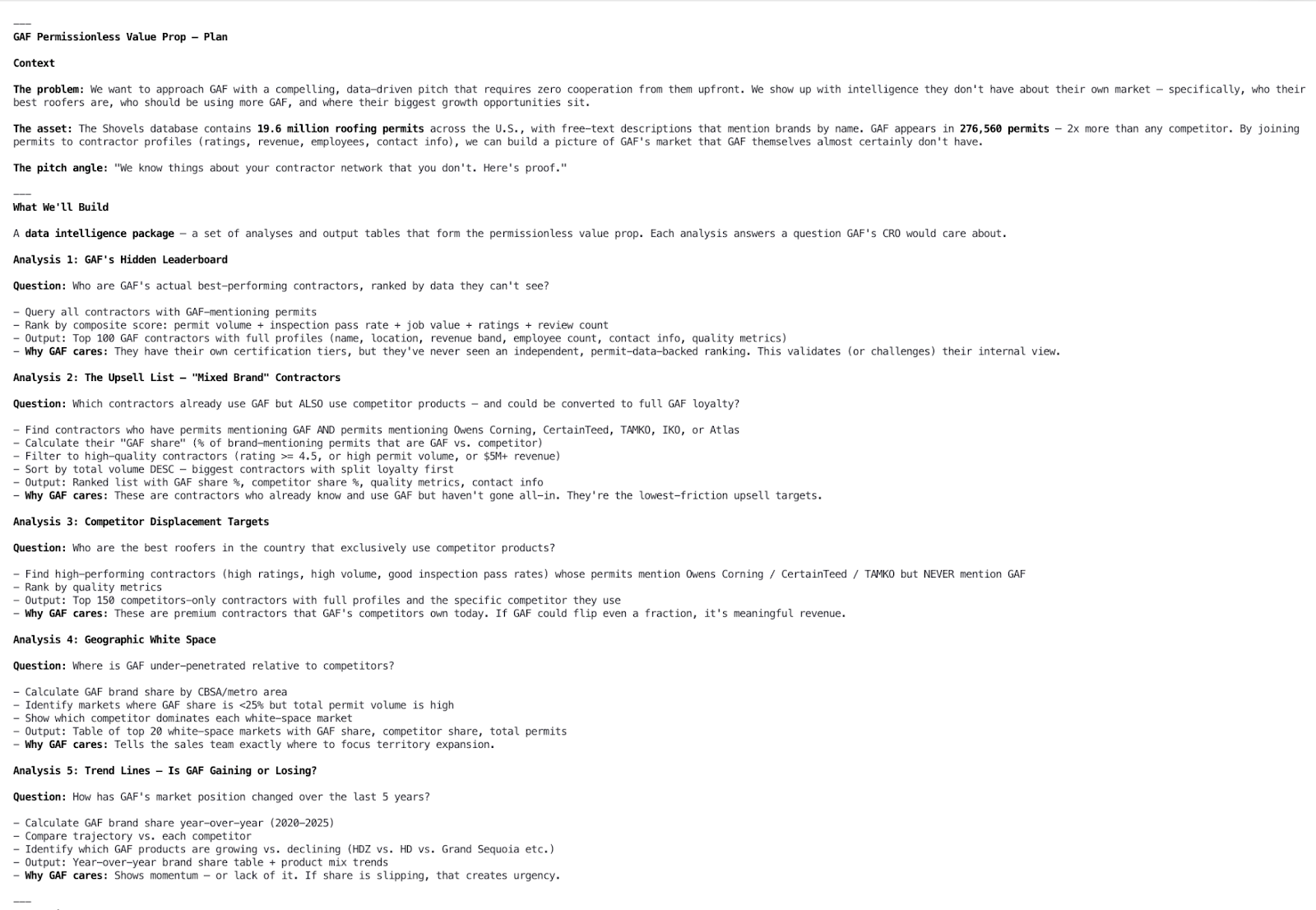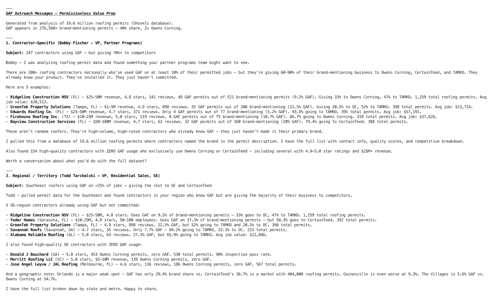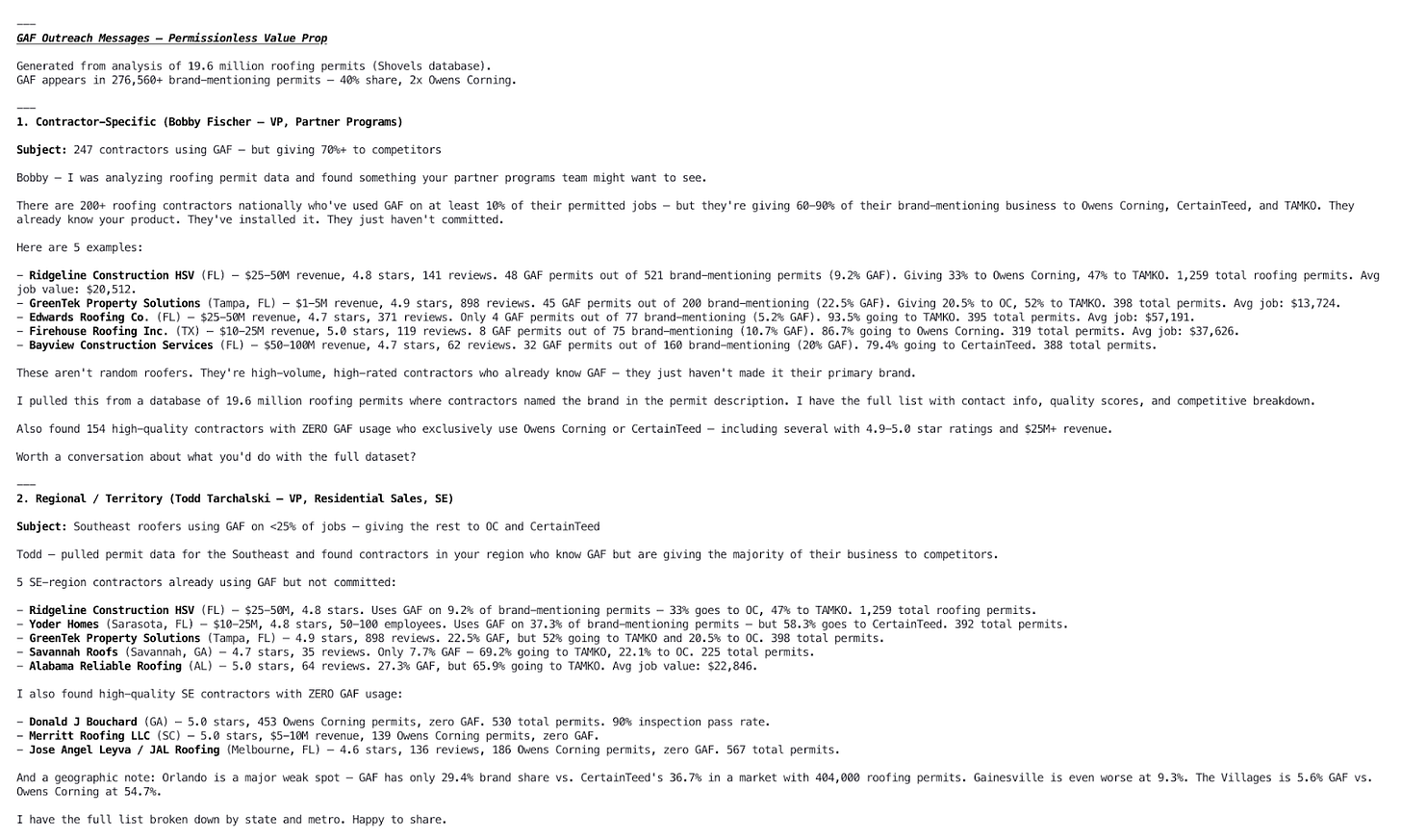 Claude Code found 19.6 million roofing permits in the Shovels database, with 276,560 permits mentioning GAF. Based on this, it identified the play on its own: upsell targets. Contractors who already use some GAF products but give 60–90% of their business to competitors like Owens Corning and CertainTeed. Claude Code even identified GAF’s competitors from the permit data without being told who they were.