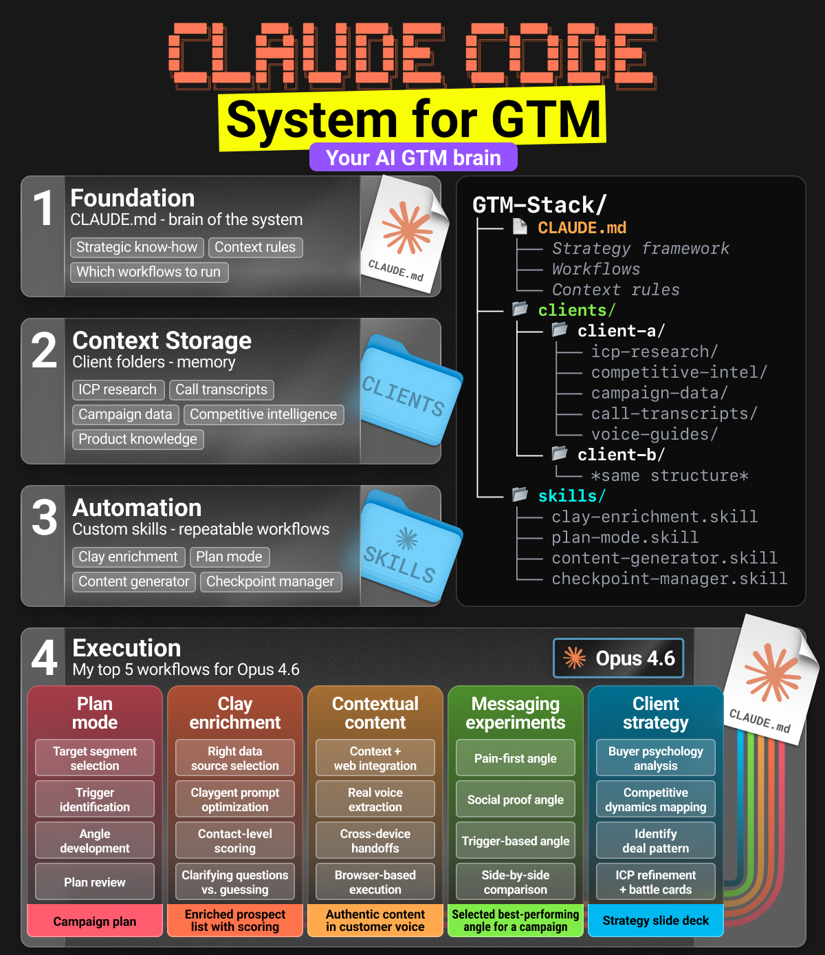 How to set up Claude Code as your GTM operating system with compounding context, persistent memory, and the ability to query databases, write scripts, and deploy sub-agents.
