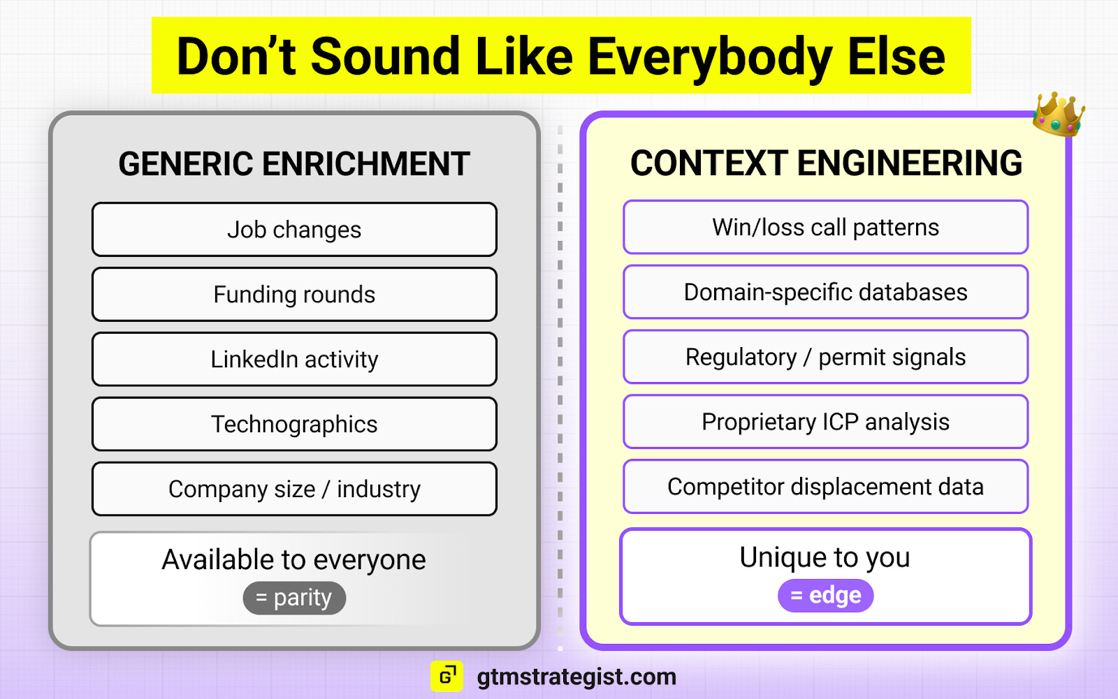 When everyone enriches from the same signal pool, the “personalization” is identical across the board. You’re all writing the same email to the same person with the same data points.
