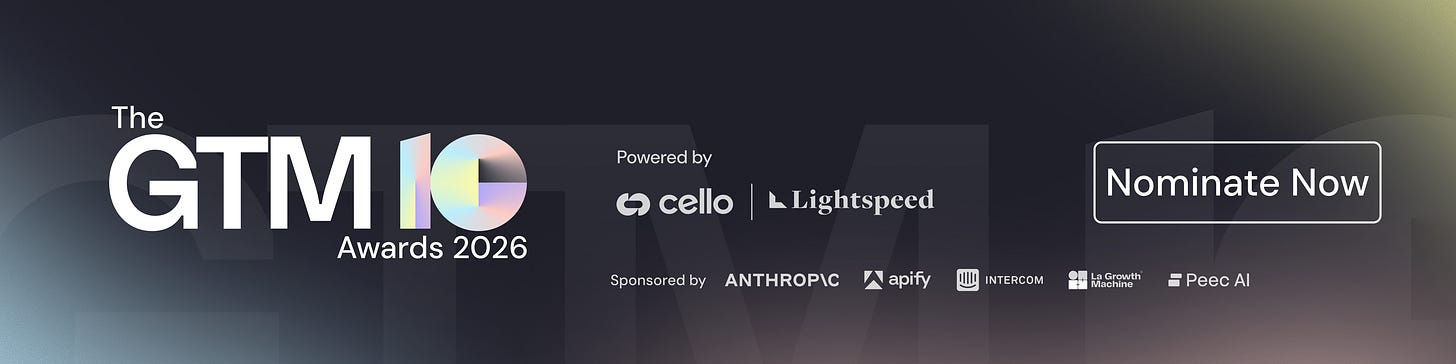 The GTM10 Awards recognize the best go-to-market leaders in software across Growth, Marketing, Sales, Customer, and Partnerships. Powered by Cello and Lightspeed Venture Partners, with a jury featuring leaders from Zapier, Vercel, Airtable, Sequoia, a16z, and Stripe.