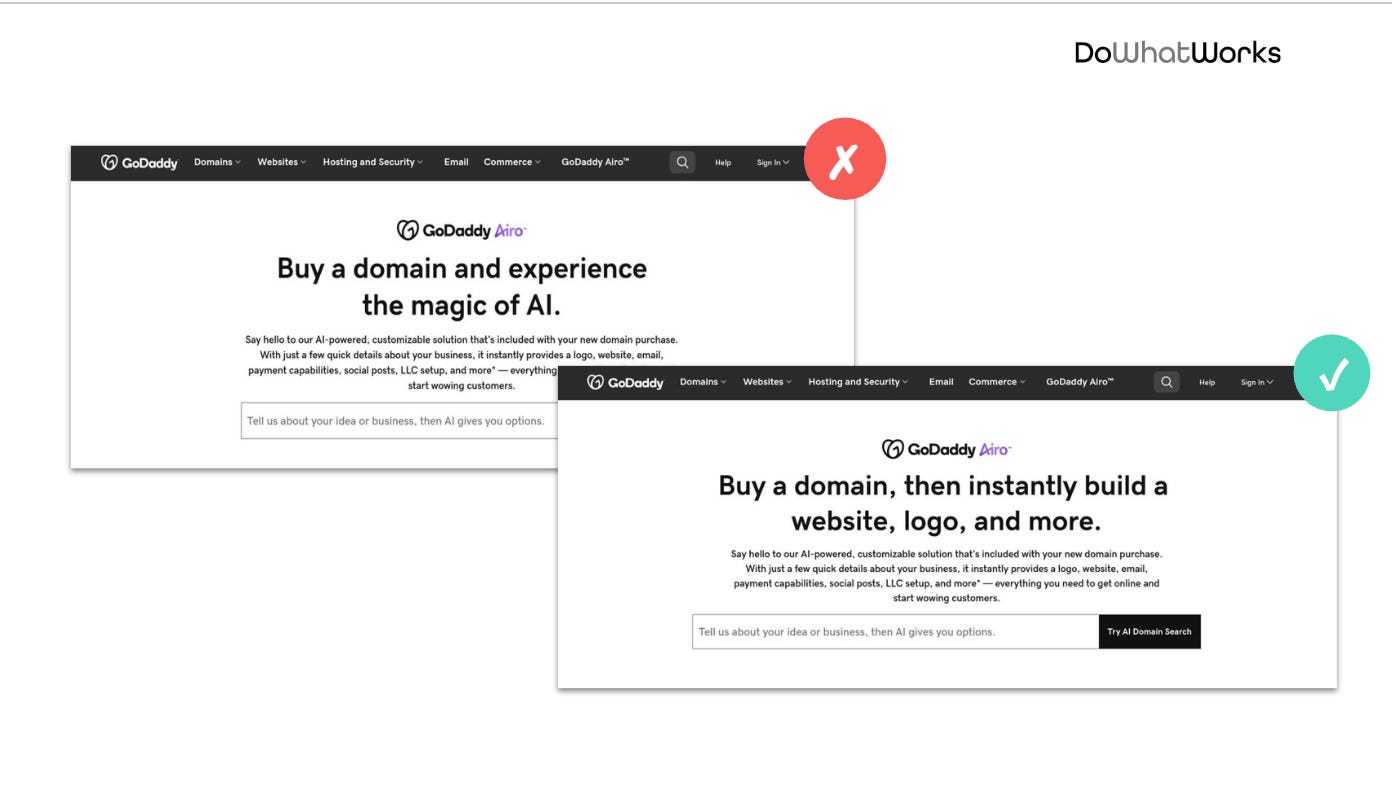 What does the data say 💡: I looked at DoWhatWork’s database of hundreds of A/B tests around AI messaging. Tests from brands like OpenAI, IBM, Hootsuite, GoDaddy, Notion, and beyond. Consistently, vague AI positioning loses, and more tangible, capability oriented language wins.
