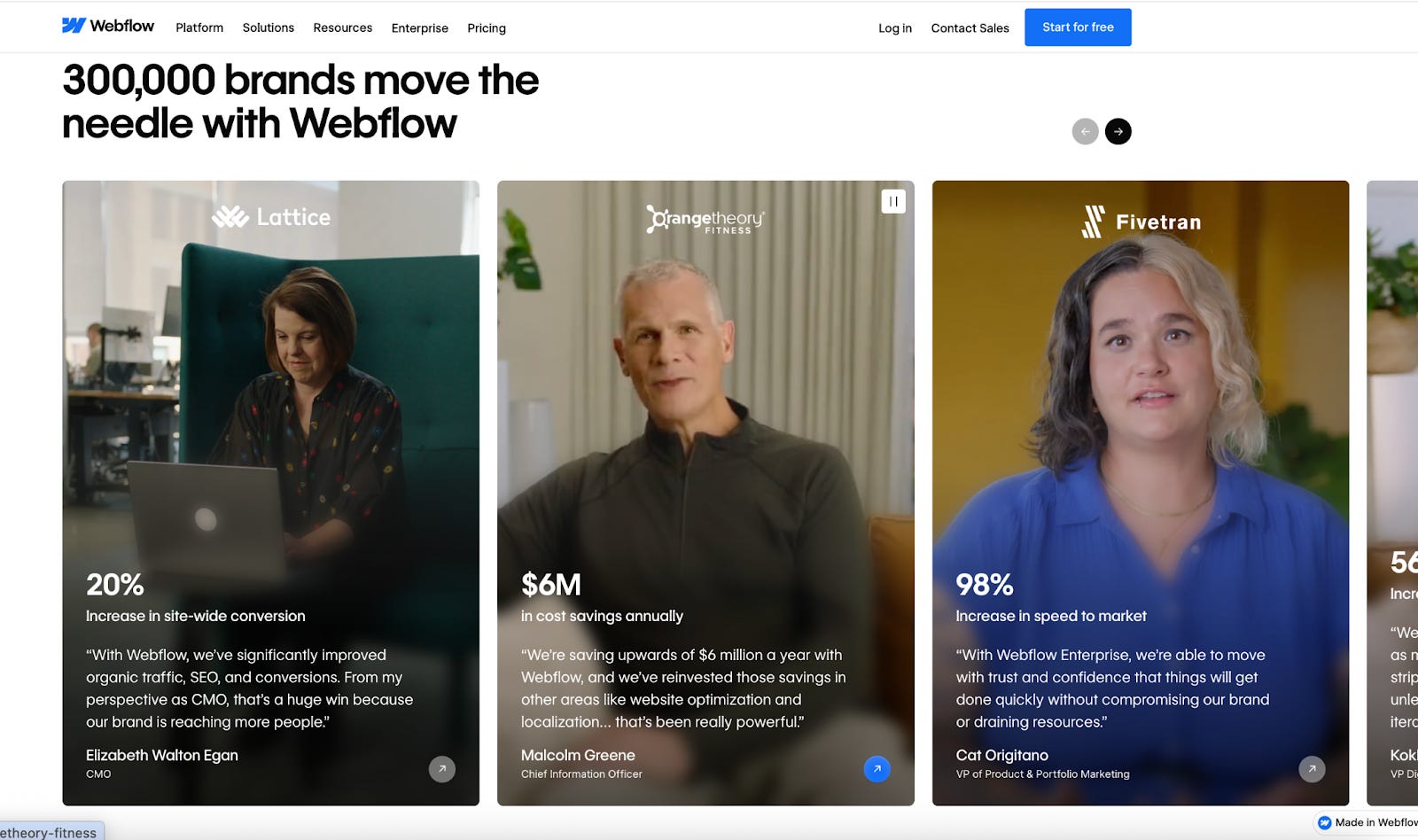 Meanwhile, if you have a video testimonial of an executive at Orangetheory (like Webflow does) talking about your product and the benefits, that gives you a lot more credibility. Ramp does the same thing.