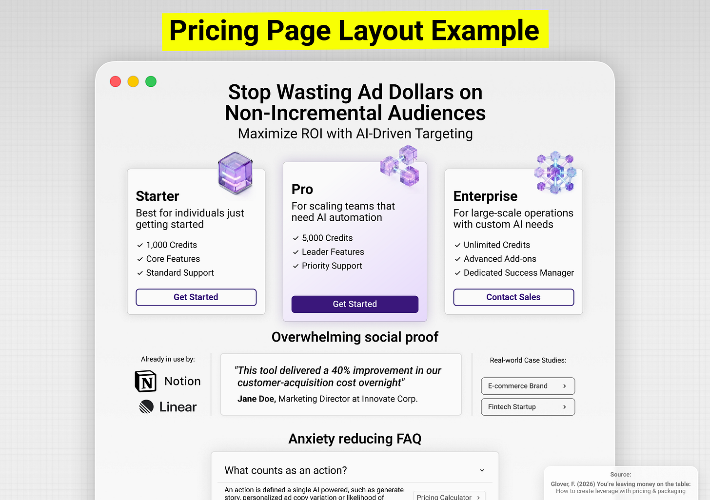 A good FAQ: This is where you handle all the “what if” anxieties. “What counts as an ‘action’?” “What happens if I go over?” “Can I roll over credits?” Answer these proactively so they don’t have to ask sales.