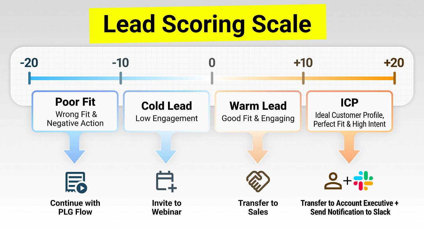 Note: This guide focuses on inbound lead scoring - evaluating prospects who have already engaged with your brand through website visits, content downloads, or product trials. If you're doing outbound (scoring accounts before first contact), you'll need to prioritize fit and external company signals over behavioral data.