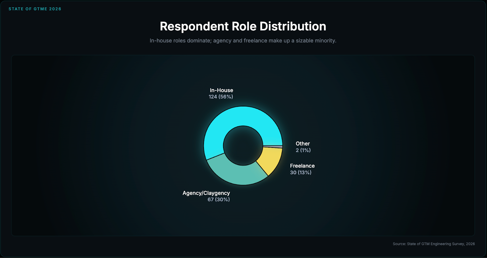 A growing share of respondents work in-house inside revenue teams, not as consultants or agencies. These operators sit directly within marketing, RevOps, or growth teams and own the internal automation layer that connects the entire go-to-market motion.