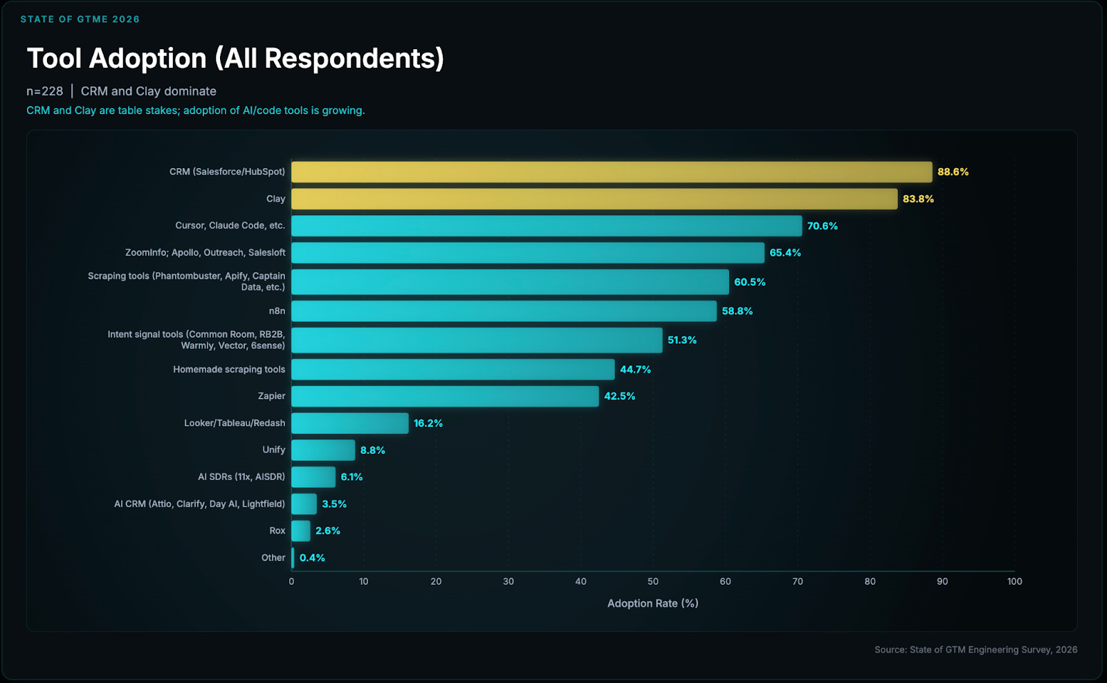 Clay has quickly become the default infrastructure for this function. Across the survey, 84% of GTM Engineers report using Clay, making it the most widely adopted tool in the entire stack.