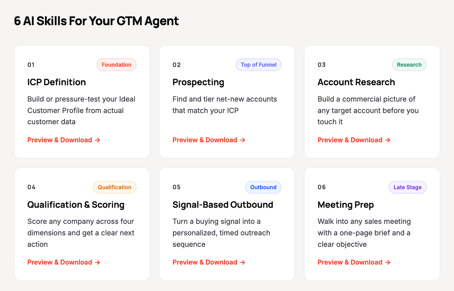 Swan built 6 FREE skills - one for every stage of the GTM motion - that give your AI agent the methodology and context it’s missing. Works in Claude, Swan AI, or any AI agent.