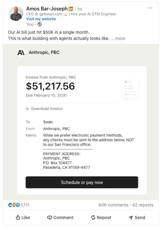 Amos-Bar Joseph, CEO and co-founder of Swan AI, famously shared his $50K monthly Anthropic bill.
