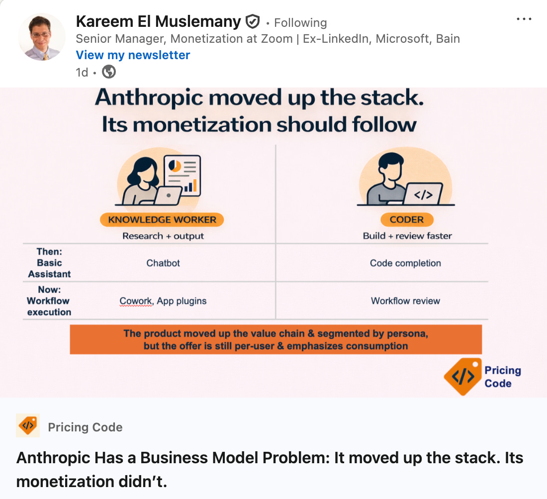 But as Kareem also points out, pricing leaders should be mindful of pure-token costs. In his post, he describes that for pure coders using Claude’s API alone, raw token costs don’t always capture the true value. Code Review, one of its highest-value developer workflows so far, is billed on token usage at $15–25 per review. That logic made sense when Claude was mainly infrastructure, but Code Review is valuable IP. Monetizing on credits alone undersells its incremental value.