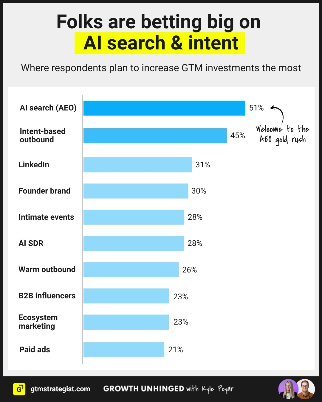 51% of GTM practitioners in the survey we did with Kyle Poyar are planning to increase their GTM investments in AI search (AEO). But how? What exactly to do?